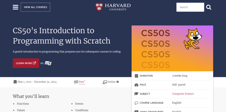 An introduction to programming using Scratch, a visual programming language via which aspiring programmers can write code by dragging and dropping graphical blocks (that resemble puzzle pieces) instead of typing out text. Used at the start of Harvard College’s introductory course in computer science, CS50, Scratch was designed at MIT’s Media Lab, empowering students with no prior programming experience to design their own animations, games, interactive art, and stories. Using Scratch, this course introduces students to fundamentals of programming, found not only in Scratch itself but in traditional text-based languages (like Java and Python) as well. Topics include: functions, which are instructions that perform tasks; return values, which are results that functions provide; conditions, via which programs can decide whether or not to perform some action; loops, via which programs can take action again and again; variables, via which programs can remember information; and more. Ultimately, this course prepares students for subsequent courses in programming. Scratch is developed by the Lifelong Kindergarten Group at the MIT Media Lab. See scratch.mit.edu