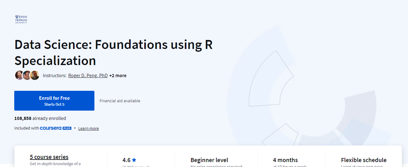 The Data Science: Foundations using R Specialization on Coursera is an excellent pathway for anyone interested in starting a career in data science with a focus on R programming. Designed for beginners, this specialization requires no prior experience in data science. Taught by experienced instructors, it includes multiple courses that you can complete at your own pace over several months, spending about five hours a week.Key Features: 1. Beginner-friendly: No prior data science or programming experience required. 2. Flexible learning: Study at your own pace with a suggested commitment of five hours per week. 3. Expert instruction: Courses are taught by experienced professionals in the field of data science. 4. Comprehensive curriculum: Learn the foundations of data science, including data manipulation, visualization, statistical analysis, and machine learning using R programming. 5. Practical projects: Engage in hands-on activities and real-world projects to build your skills and portfolio. 6. Career preparation: Get ready for data science roles with resume-building resources, career guidance, and job search support. 7. Certification: Earn a professional certificate upon completion to validate your data science skills using R.Benefits: 1. High-demand skills acquisition: Acquire skills highly sought after in today’s job market, including data manipulation, statistical analysis, and R programming. 2. Career advancement opportunities: Enhance your career prospects and employability in a variety of industries, from tech and finance to healthcare and research. 3. Practical knowledge application: Gain hands-on experience with R programming and data analysis, allowing for immediate application in professional settings.This specialization provides a robust foundation in data science with R, equipping you with the essential tools and knowledge needed to succeed in the data science field.