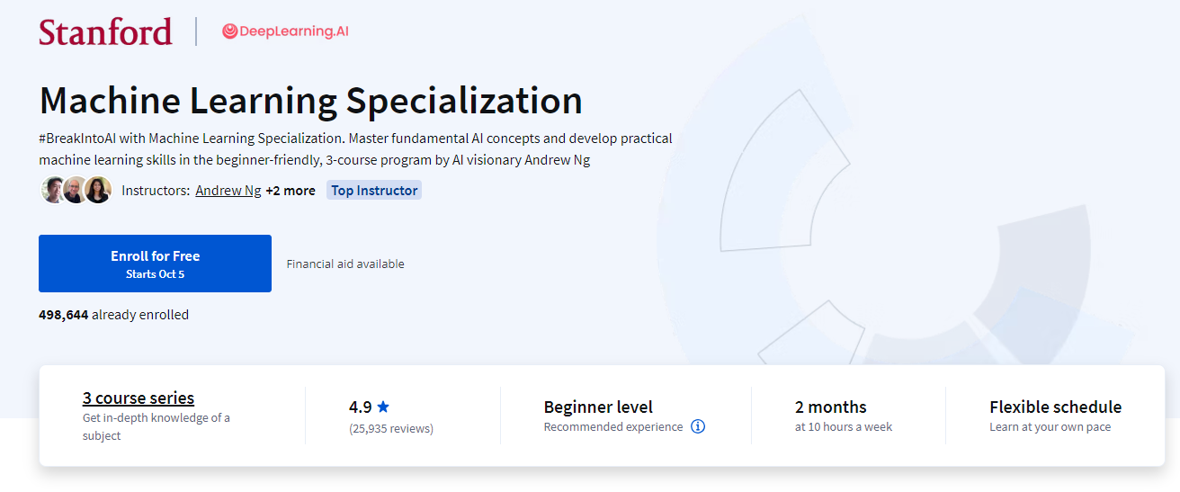 The  Machine Learning Specialization on Coursera is an in-depth program designed for individuals looking to gain a comprehensive understanding of  machine learning. Suitable for learners with some basic programming knowledge, this course does not require extensive prior experience in machine learning. Taught by renowned instructors from Stanford University, it includes multiple courses that you can complete at your own pace over several months, spending about five to ten hours a week.Key Features: 1. Intermediate level: Some basic programming knowledge required, but no extensive machine learning experience needed. 2. Flexible learning: Study at your own pace with a suggested commitment of five to ten hours per week. 3. Expert instruction: Courses are taught by renowned instructors from Stanford University. 4. Comprehensive curriculum: Learn the fundamentals and advanced concepts of machine learning, including supervised and unsupervised learning, neural networks, deep learning, and reinforcement learning. 5. Practical projects: Engage in hands-on activities and real-world projects to apply machine learning algorithms and techniques. 6. Career preparation: Get ready for machine learning roles with resume-building resources, career guidance, and job search support. 7. Certification: Earn a professional certificate from Stanford University to validate your machine learning skills.Benefits: 1. High-demand skills acquisition: Gain skills that are highly sought after in today’s job market, including machine learning, deep learning, and artificial intelligence. 2. Career advancement opportunities: Enhance your career prospects and employability in various industries, from tech and finance to healthcare and research. 3. Practical knowledge application: Develop practical skills that can be immediately applied in professional and academic settings using machine learning.This specialization provides a robust foundation and advanced knowledge in machine learning, equipping you with the essential tools and techniques needed to excel in the field.