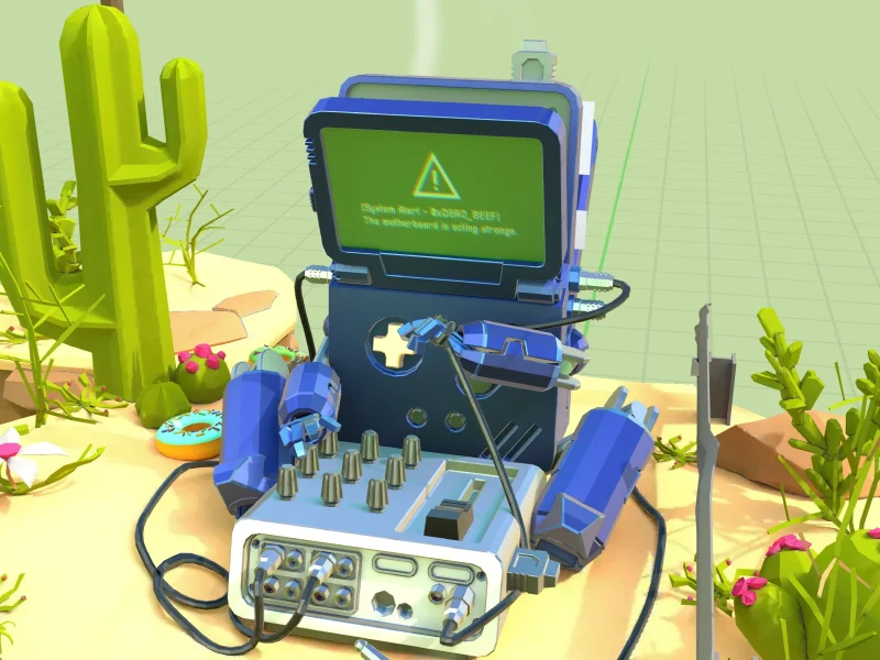 The cartoonish, retro, and slightly derelict 3D world was designed, baked, and hand-painted in Blender, then heavily compressed for a worn, imperfect look. Two sets of three baked textures—for light and dark modes—total just 3 MB.